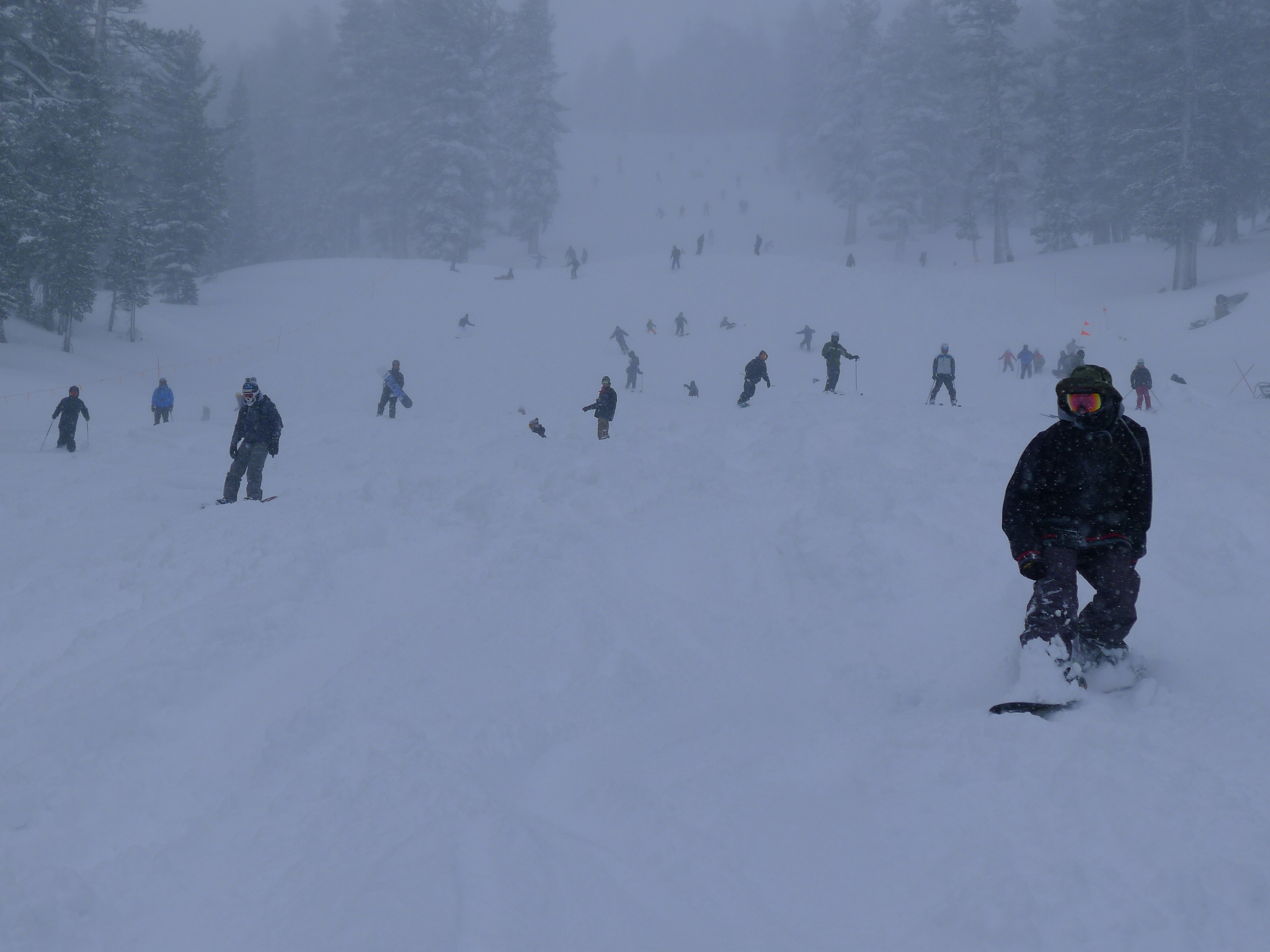 We didn’t make it up over Thanksgiving this year due to family stuff in the Bay Area so this weekend was our first skiing of the season.  Luckily we hit pay dirt with the first day being a big snow day.  We ended up with about 20″ at the house, and 30″ at the top of Heavenly.  There was a HUGE line at the Gondola (or “Gondanola” as we heard some first-time snowboarder call it!) on Saturday morning because they didn’t open until 10AM due to wind, and the Gondola was the only way to get up on the mountain.  We didn’t take our first turns until 11:50AM.  With only 4 runs open, long lines, and a temperature of about 5 degrees and strong winds, we only stayed for a couple of hours.  This was the scene on the Comet run just after it opened for the first time this season.  You would have thought it was the first day Mott was opening if you didn’t know better!