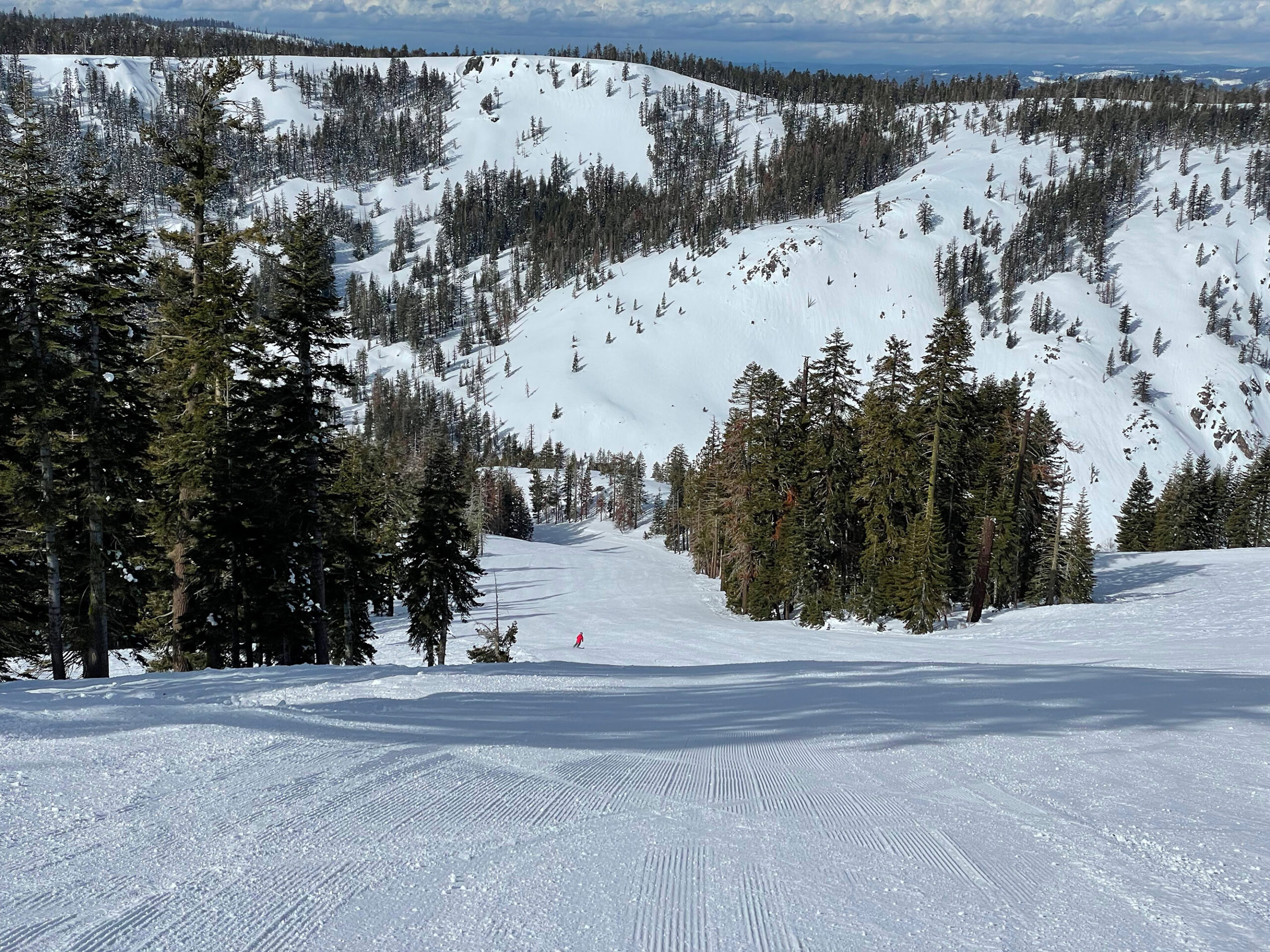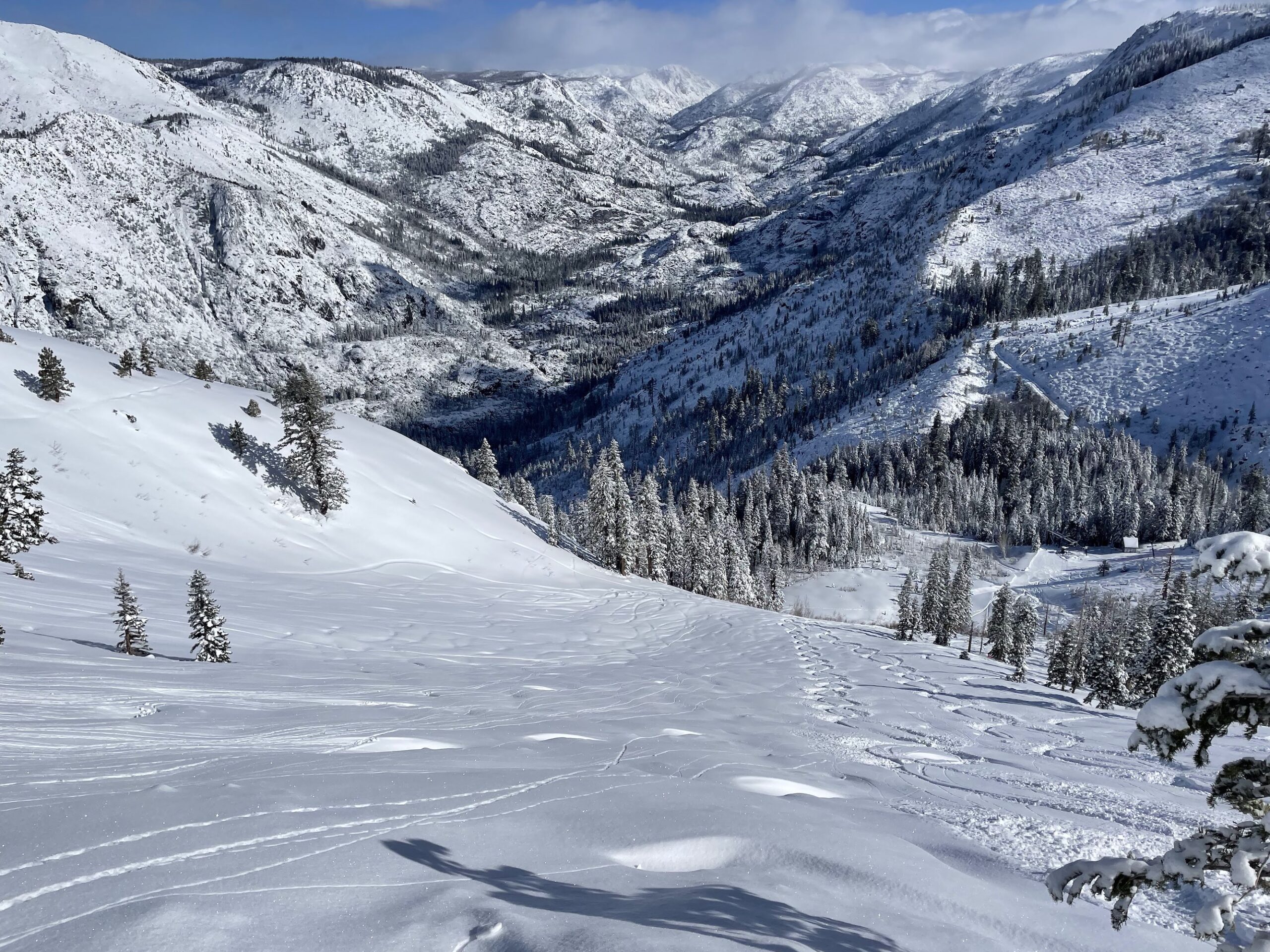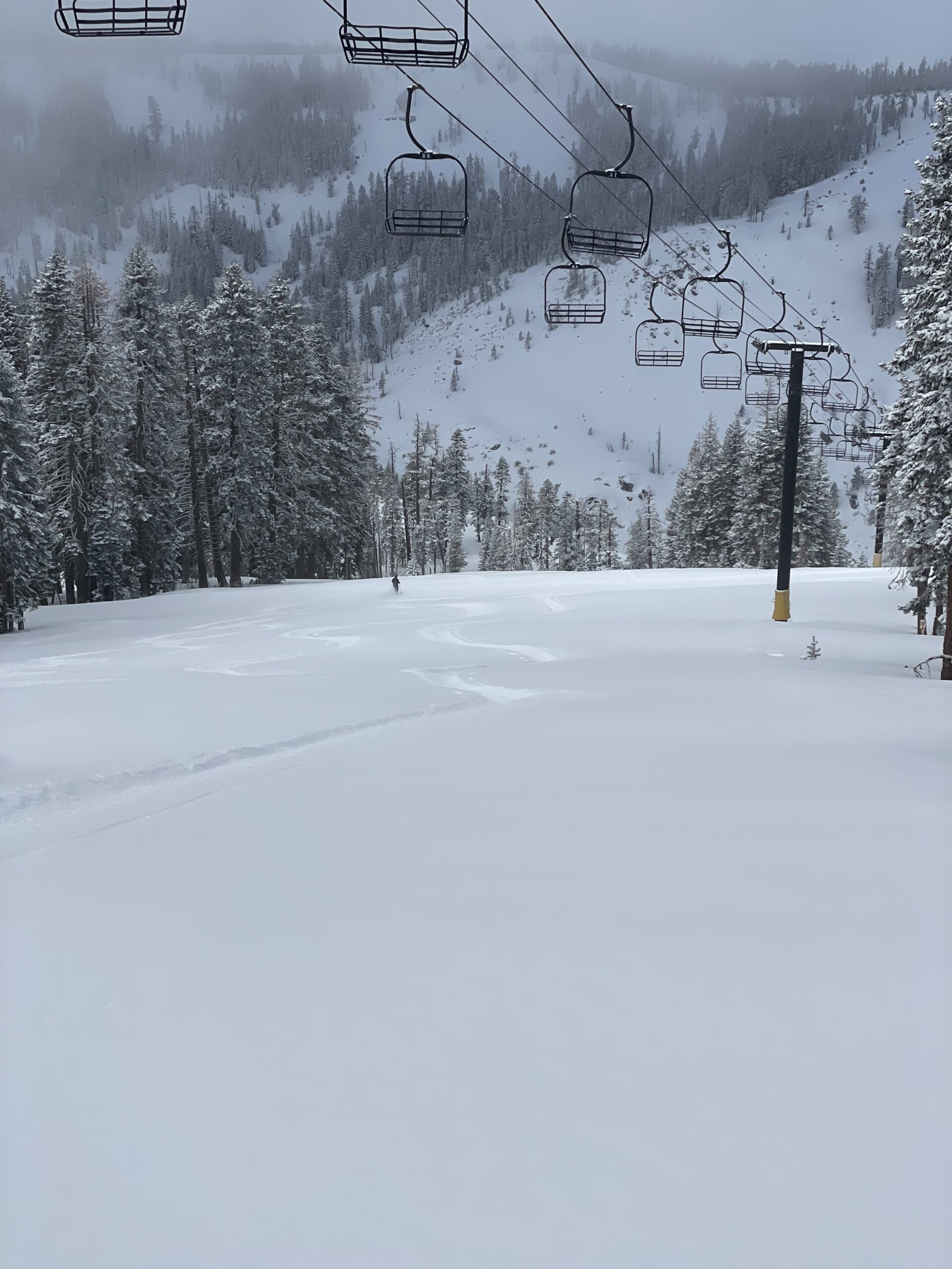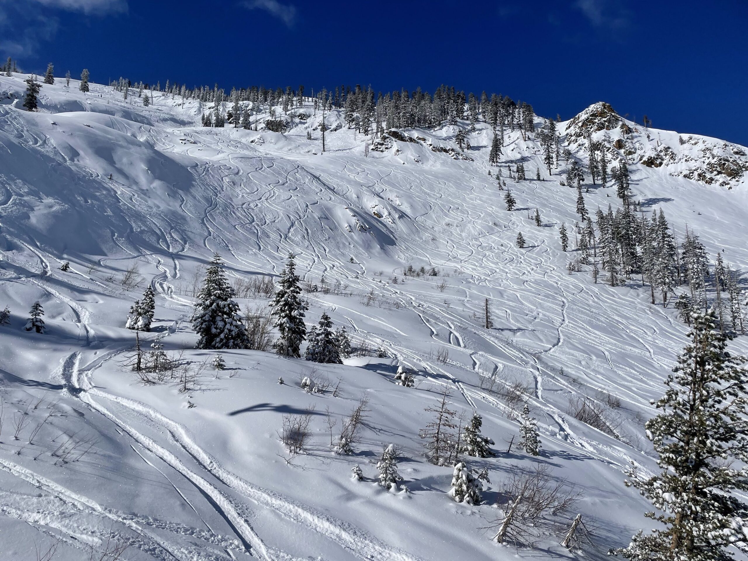 The best run for me on a powder day is from the top of the Mokelumne Express entering the first gate on West Ridge. Follow the razor-back ridge to the Fools Bowl area. Ski the easier treed part and then cut over to Strawberry Fields below the cliff band. One of those was in fact my best run of the 24/25 season.