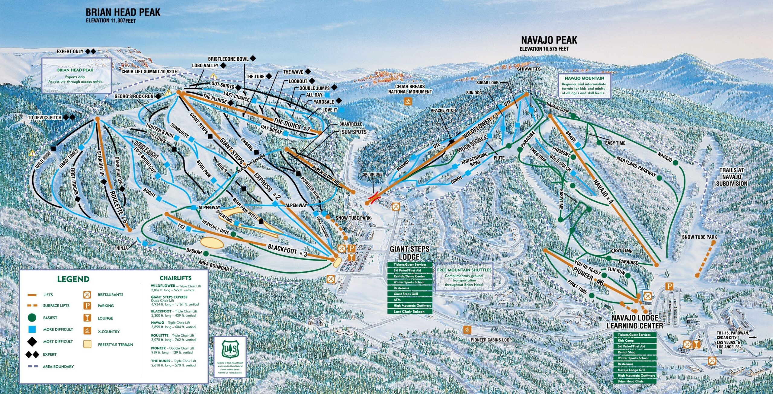 Brian Head is not on the list of 100 top resorts since it doesn’t meet the minimum criteria of 1,400 vertical feet. When we visited it was since they were publishing a vertical of 1,548 feet. That’s not lift-served continuous vertical though, and after doing more careful research on a map the true vertical is only 1,200 feet. So it was removed but we are keeping the review here.
