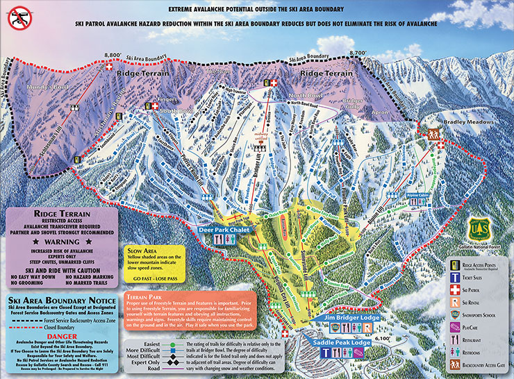 Bridger is laid out on a long ridge that faces east and gets progressively steeper from north to south. It’s fan-shaped and at the bottom the Sunnyside quad is the main access to the rest of the mountain but is all flat beginner terrain. At the North end you can pretty much skip the Alpine lift as well because it is also flat and short. It starts to get interesting on the Powder Park lift with steeper blues and a few short blacks, but we never spent much time there because the next 3 lifts are so much better.