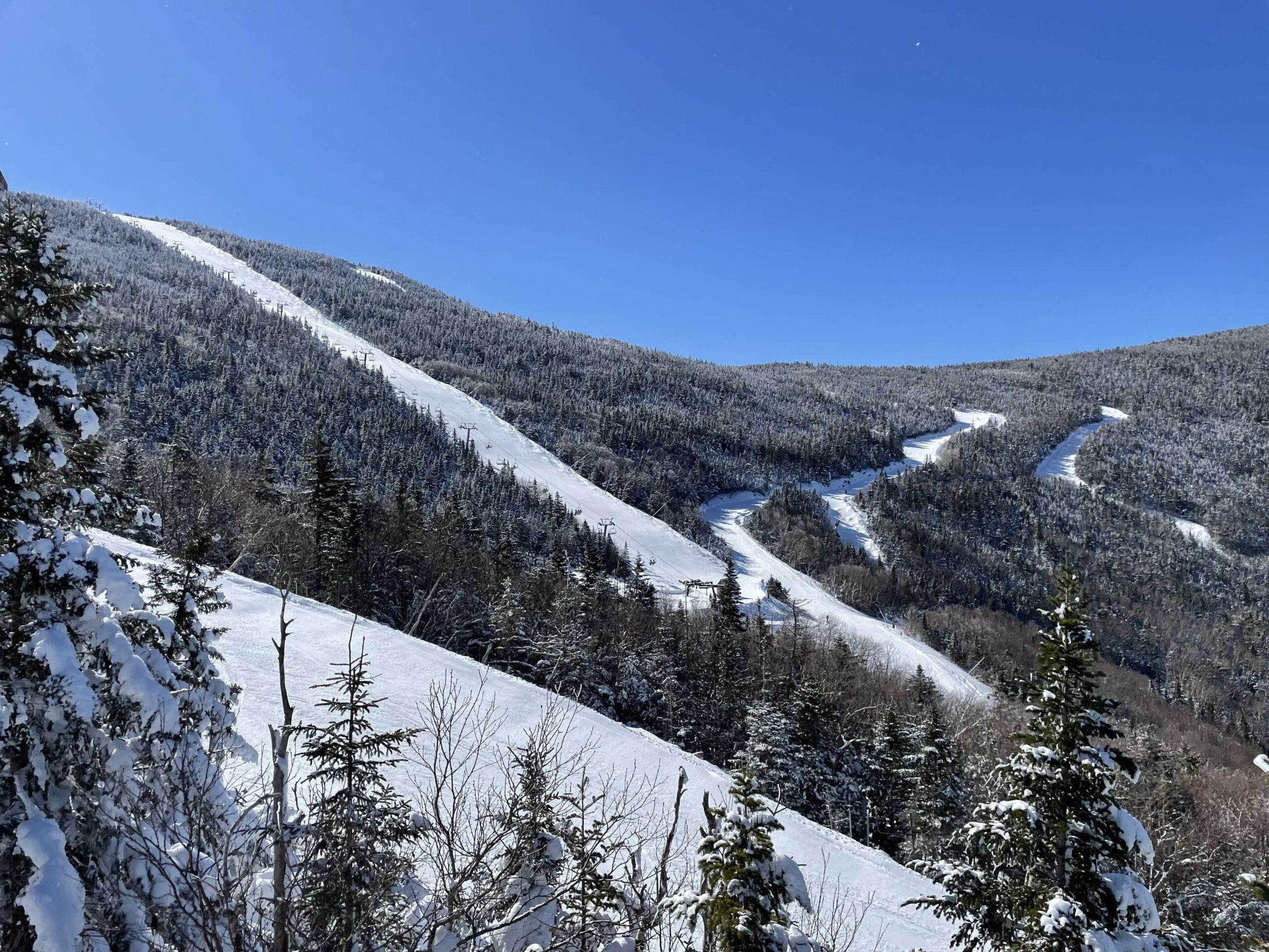 A fun top-to-bottom run is “Taft Slalom” to “Upper and Middle Hardscrabble”. The Hardscrabbles were really the only non snowmaking-covered terrain we skied. It is a memorable winding narrow bumpy run — classic New England skiing all the way.