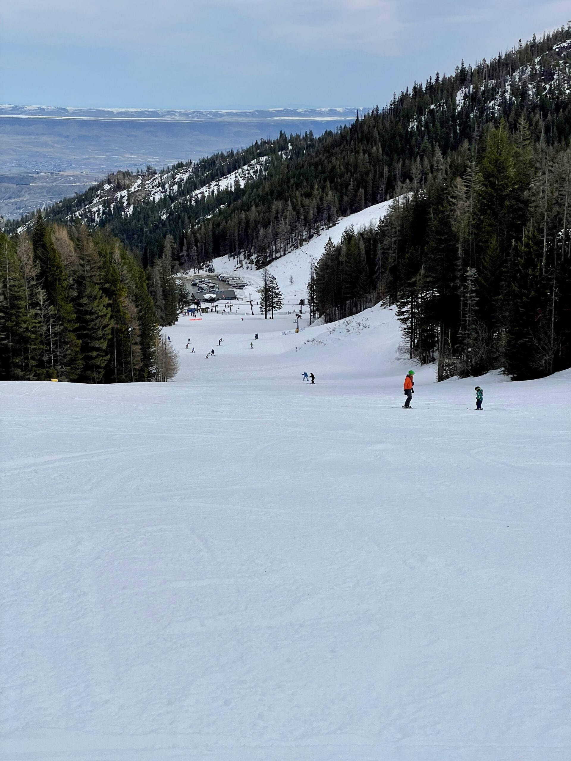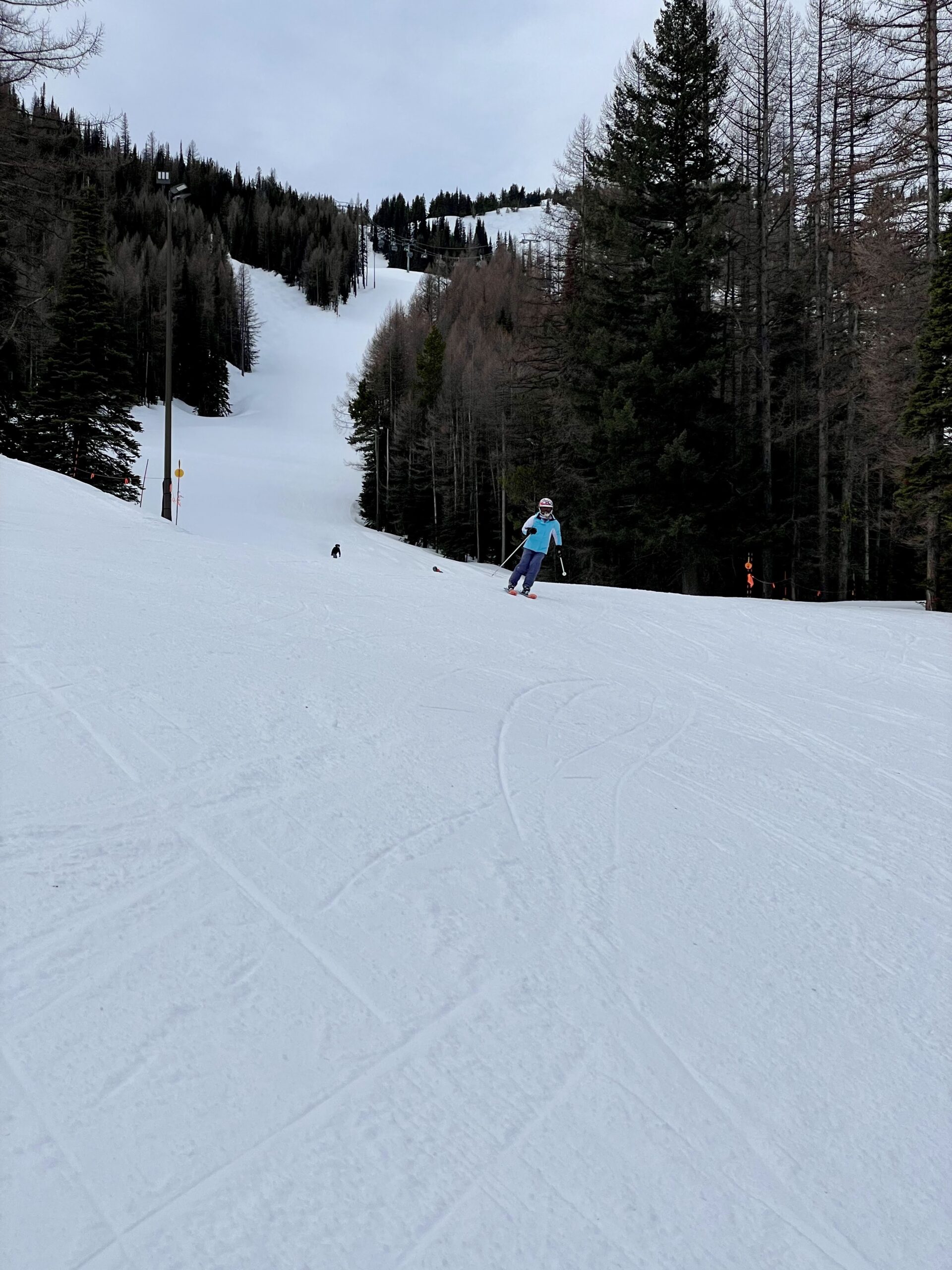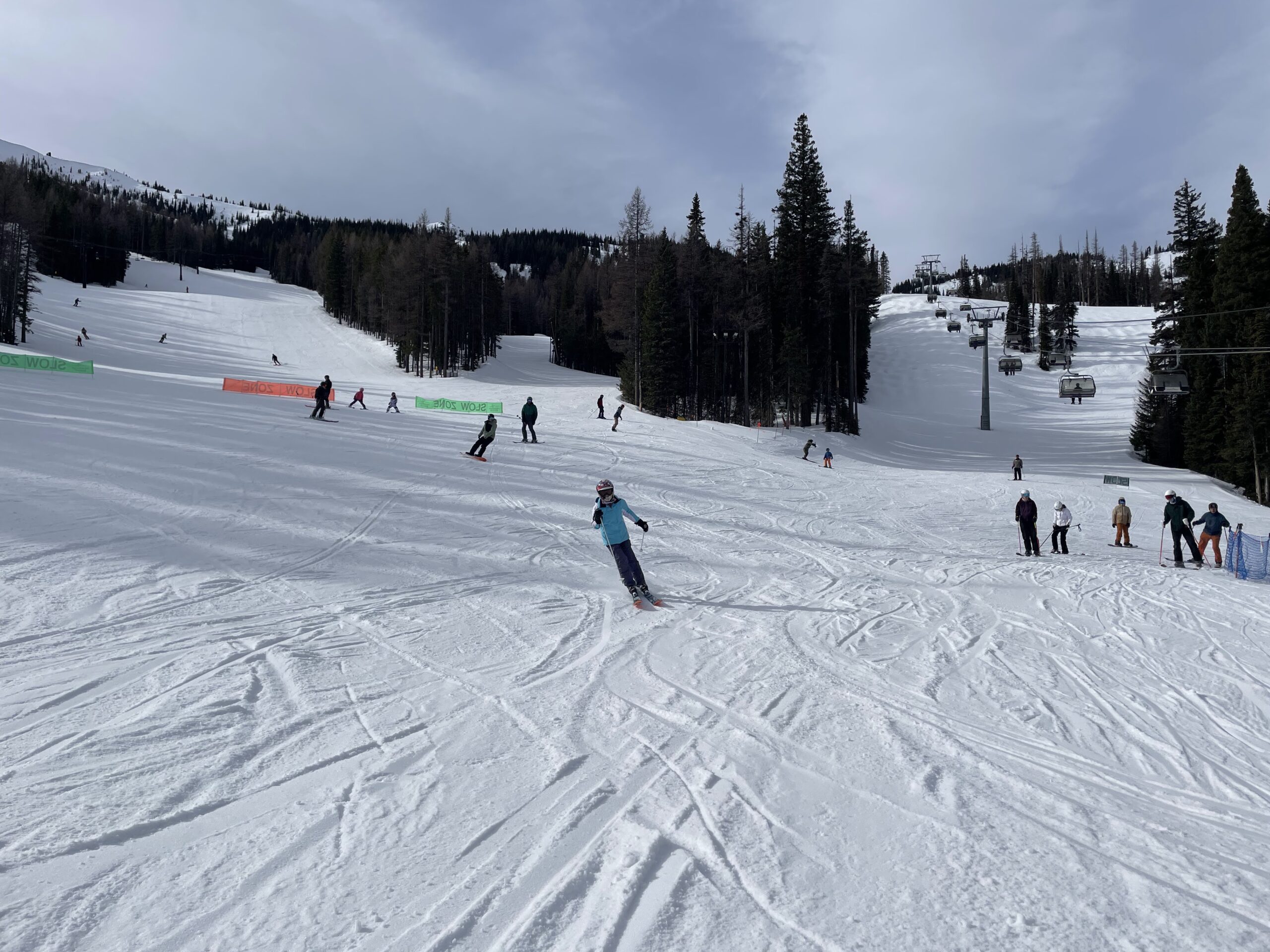 This lift pod provides some great long winding intermediate groomers and we did many laps there. Our favorite run on the mountain was North Bomber to Bomber Bowl. It’s a roller with lots of interesting twists and turns. There are also 13 distinct black and double-black runs off the top and in the middle of the bowl. Those are all pretty short though. We did take Johnson’s which is marked double-black and is pretty steep with big moguls.