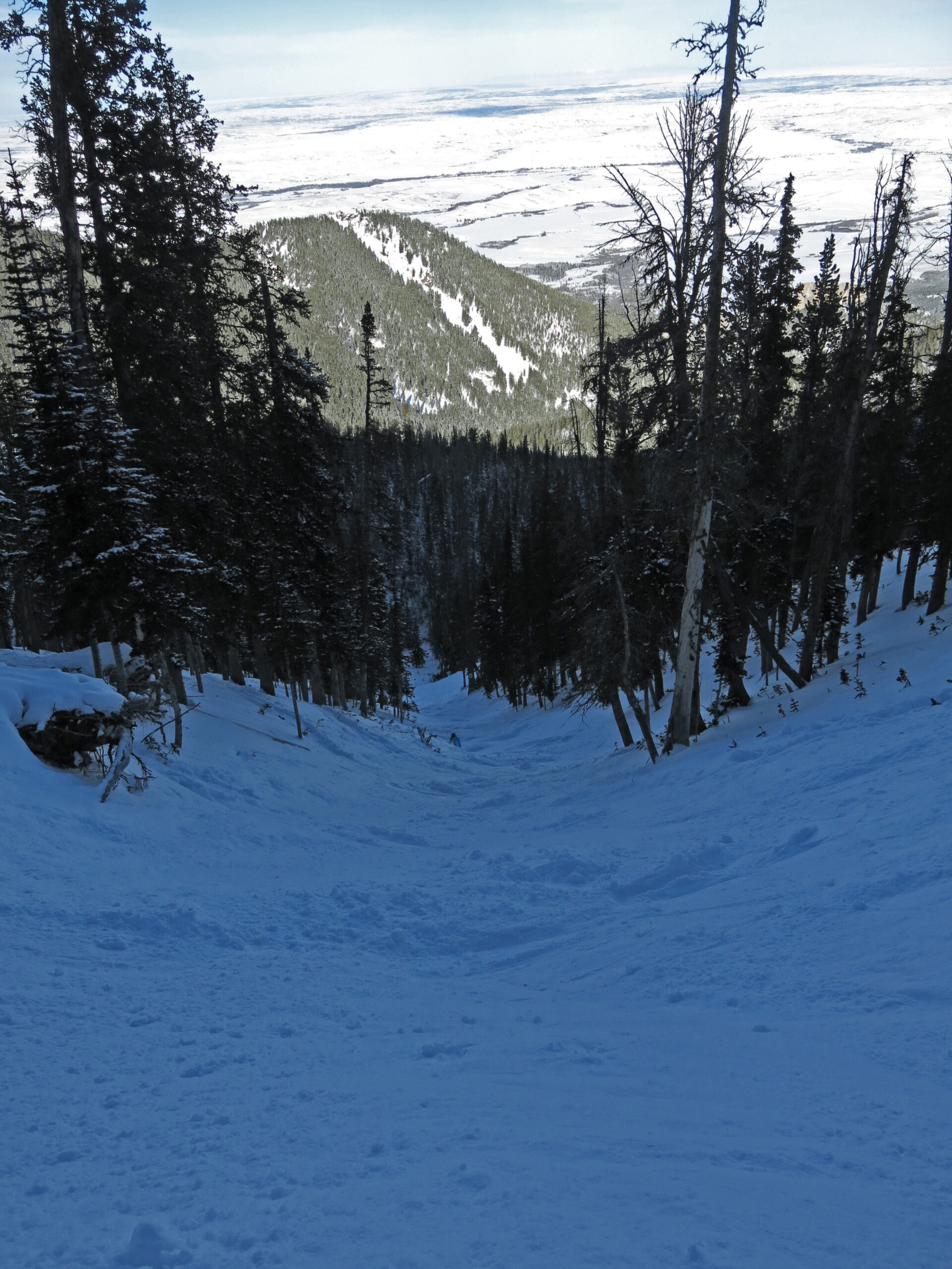 We were able to ski one of the 2 double-black runs open: Buckin Chute. This was reminiscent of some of the steep chutes at Taos, with a rocky steep entry funnelling down into a halfpipe chute. Lots of fun, and refreshingly steep.