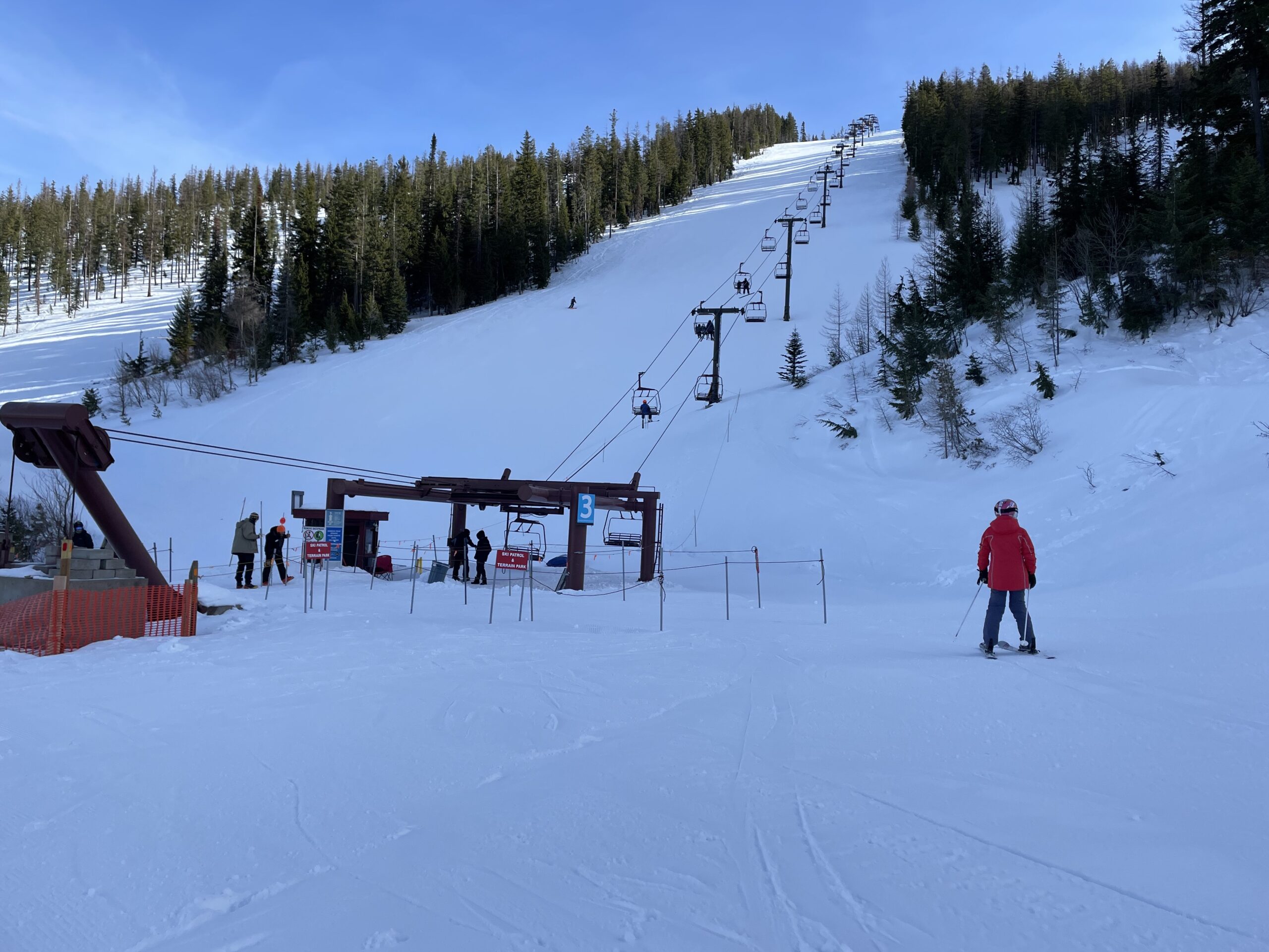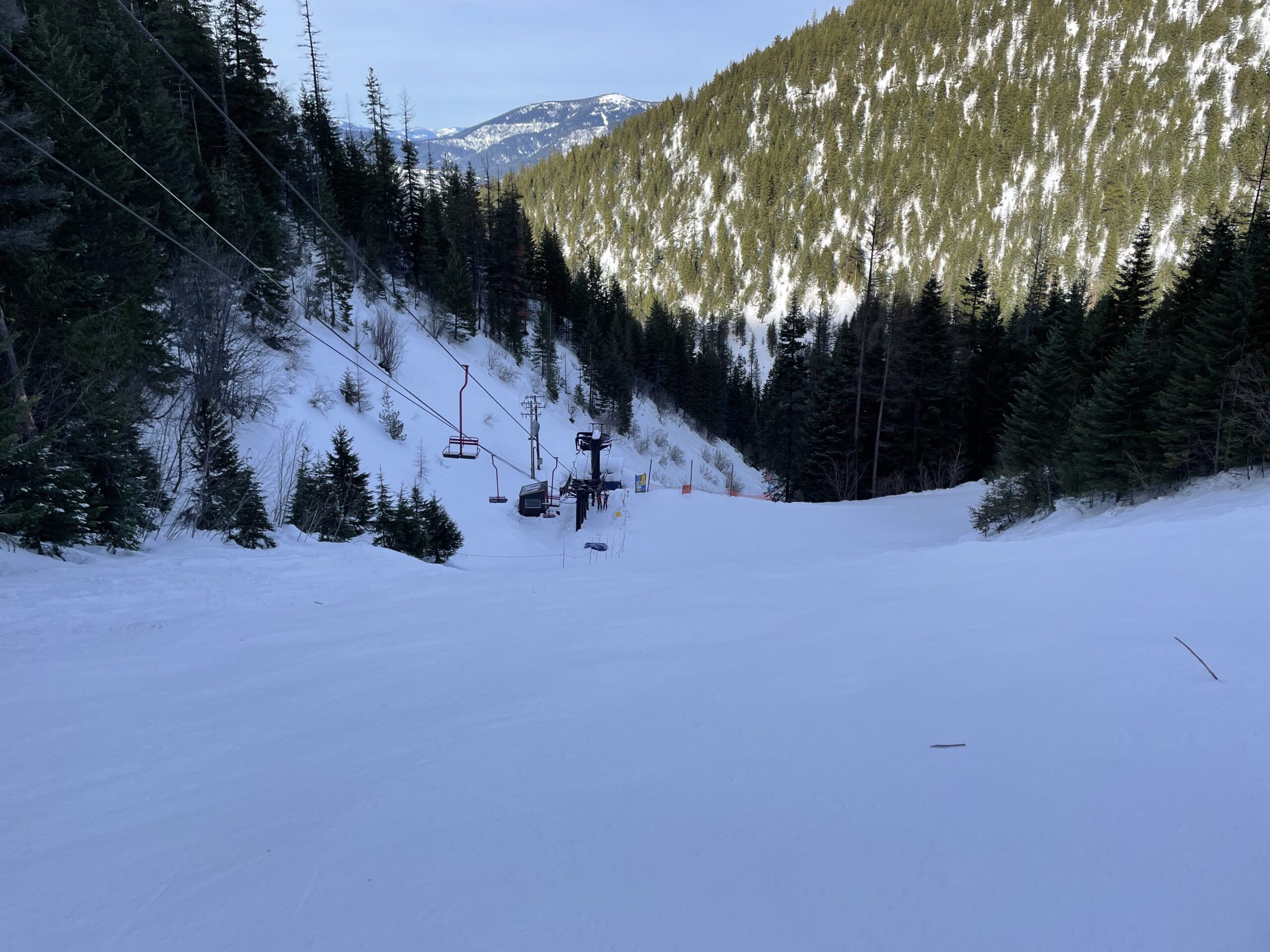Chair 1 (the only quad strangely) faces due south and wasn’t skiable when we were there due to refrozen conditions. They hadn’t groomed anything on that chair other than the main run everyone uses to get from the top of the gondola down to Chair 2.