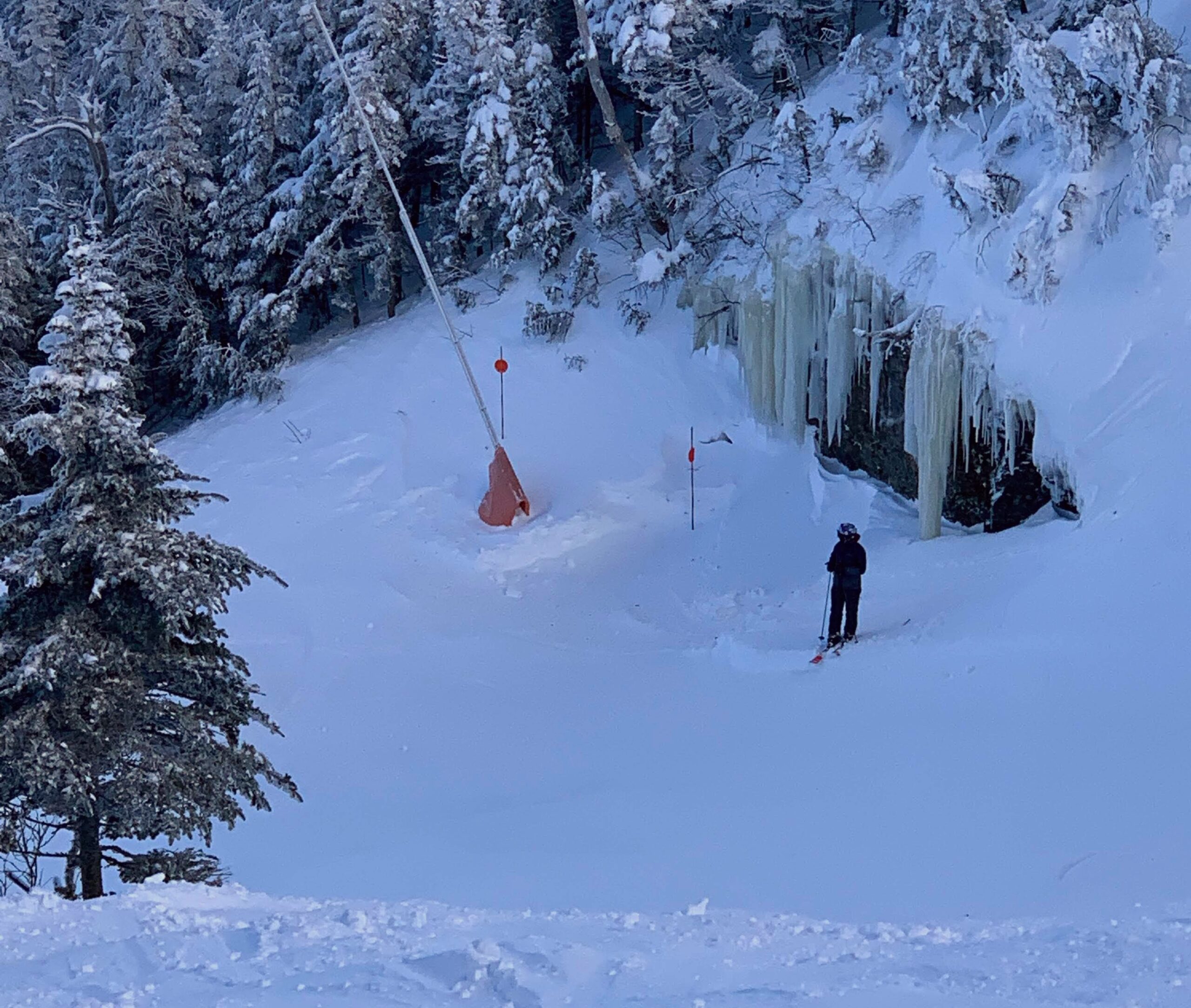 Outside there was 8″ of powder to ski though, so after a short warm-up we got after it. This was fantastic snow! No ice, no crowds, and a completely different environment for us compared to our usual spots in the west. It was so cold that we spent most of the day on the Gondola side so we could have a warm(er) ride up at least. The runs off the Gondola are very interesting with a perfect advanced intermediate pitch.