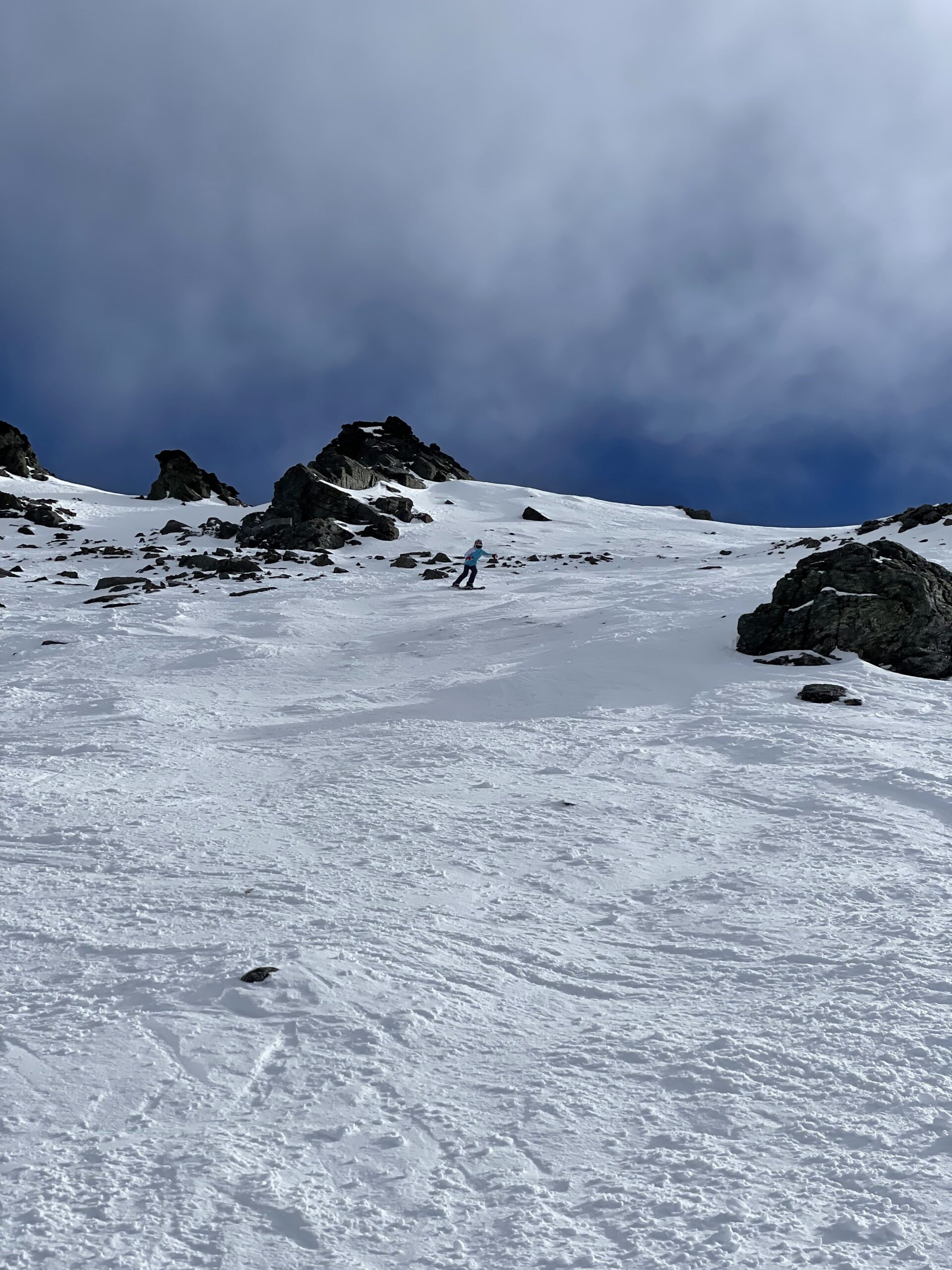 This is the most interesting and difficult ski pod at The Remarkables. We skied just about everything that was open there, including a couple of excursions down to Alta Lake on the Alta run. This is where we found the best/deepest natural snow. Getting to Alta required a road and then a scramble over rocks with skis on. It was very windy and icy so skis off didn’t seem like a great idea. The bottom past the lake gets interesting with less snow and a lot of boulders to ski around.